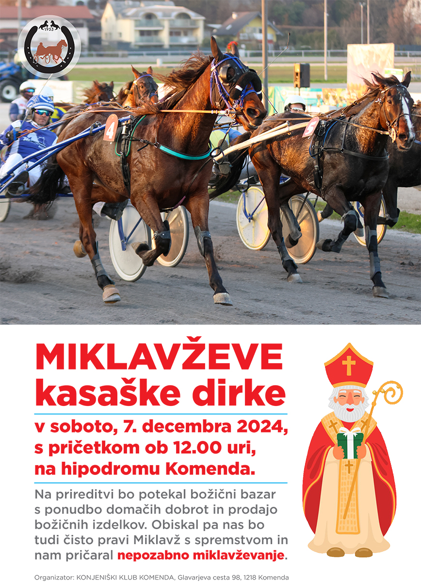 V soboto, 7. decembra 2024, s pričetkom ob 12. uri, na hipodromu v Komendi. Na prireditvi bo potekal božični bazar s ponudbo domačih dobrot in prodajo božičnih izdelkov. Seveda nas bo obiskal tudi čisto pravi Miklavž s spremstvom in nam pričaral nepozabno miklavževanje!